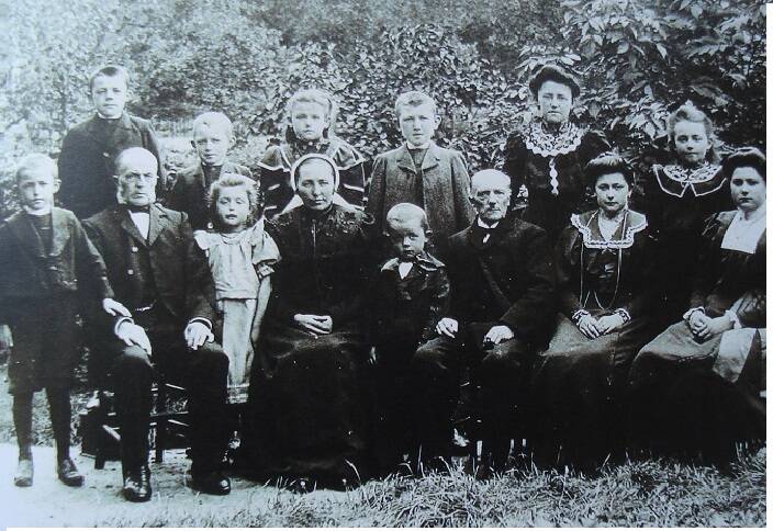 Het gezin Mentink van de Boerhaar in 1914. Vader Arnold en moeder Johanna Beltman met achter vader zijn zoon Hein, die zijn vader volgde als molenaar. In het midden achter Gerrit, die molenaar werd op de Boskamp. Links Willem die priester werd en rechts de twee zussen Benigna en Johanna Maria, die hun beroep als non uitoefenden. Bron: mentinkspots.wordpress.com